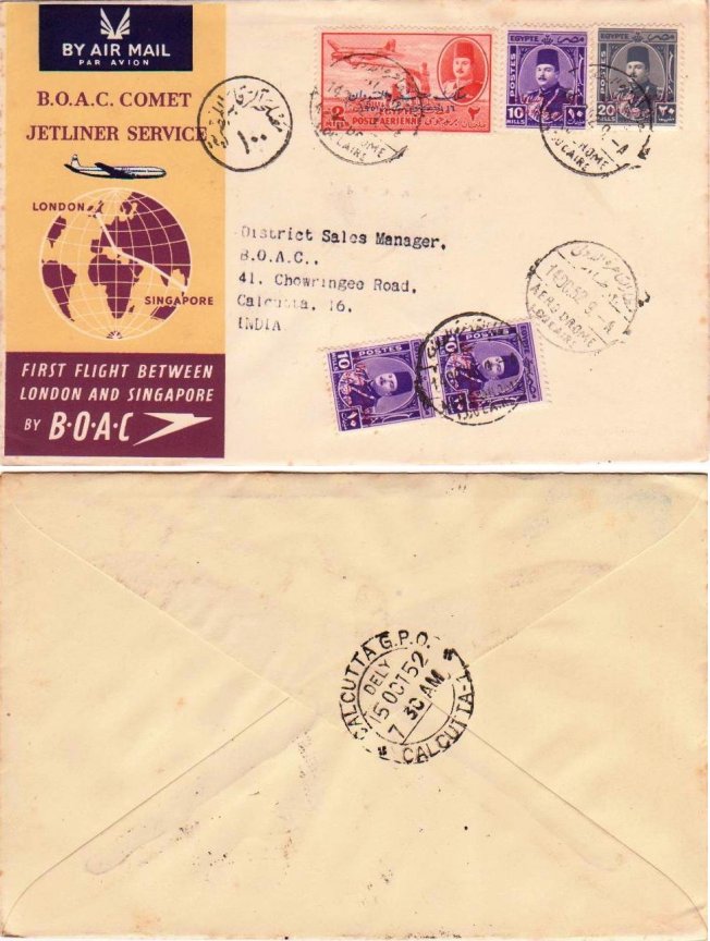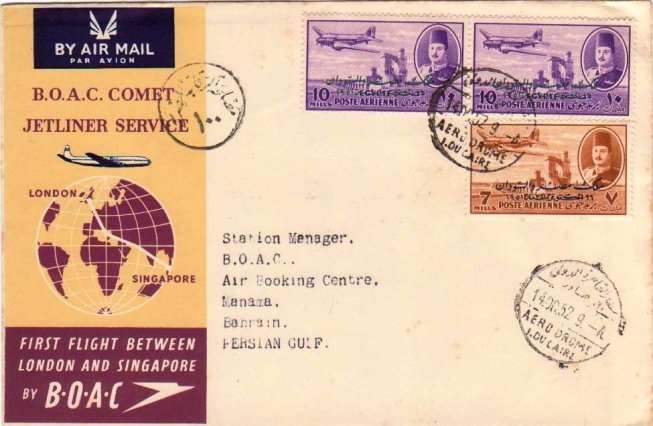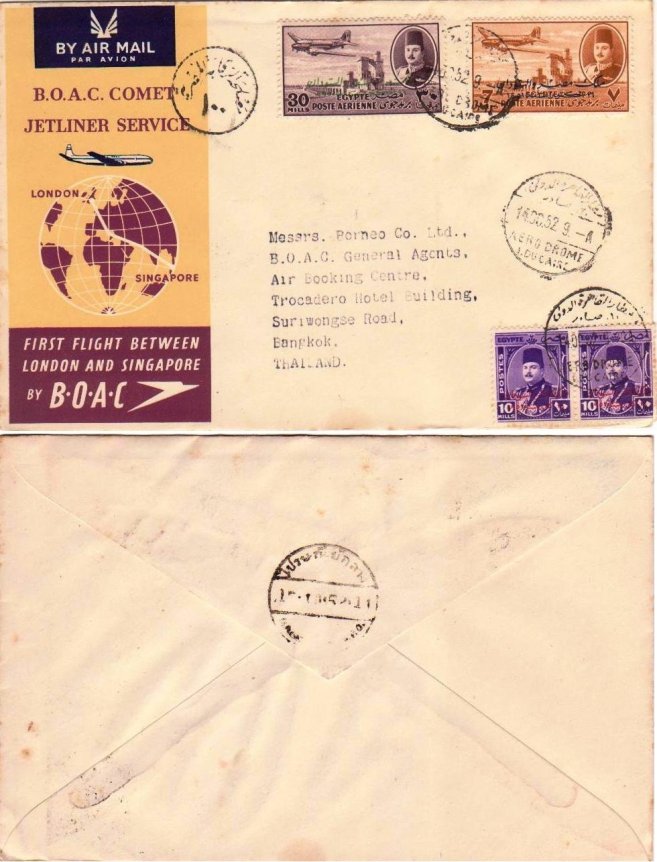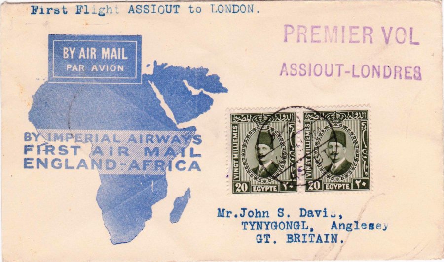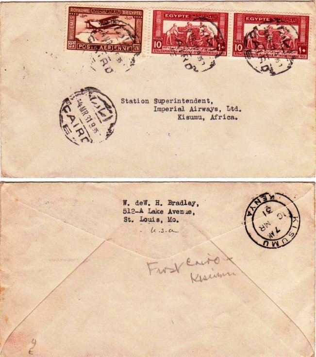 | 85 | 4 MR 31, plain cover addressed to Imperial Airways, Kisumu, and marked in pencil behind "First Cairo-Kisumu". Franked 27m chestnut Air Mail (SG 133) plus pair of 10m Agriculture Exhibition and cancelled Cairo / E. Kisumu arrival behind 10 March  | £12.00 |