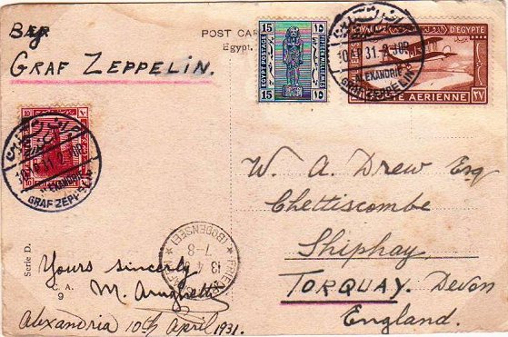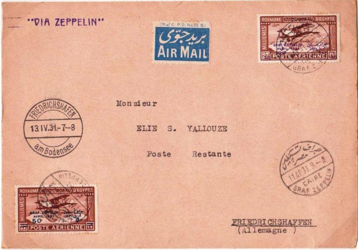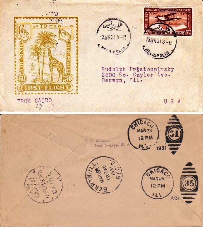| 86 | 13 MR 31, cover illustrated with Cape to Cairo First Flight and giraffe vignette, addressed to USA and franked 27m chestnut Air Mail stamp (SG 133) from Heliopolis. Handstamped "From Cairo", with Cairo and three US handstamps behind. Unusual  | £6.00 |