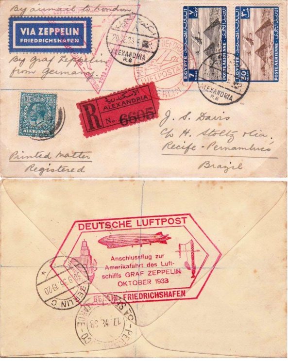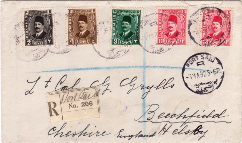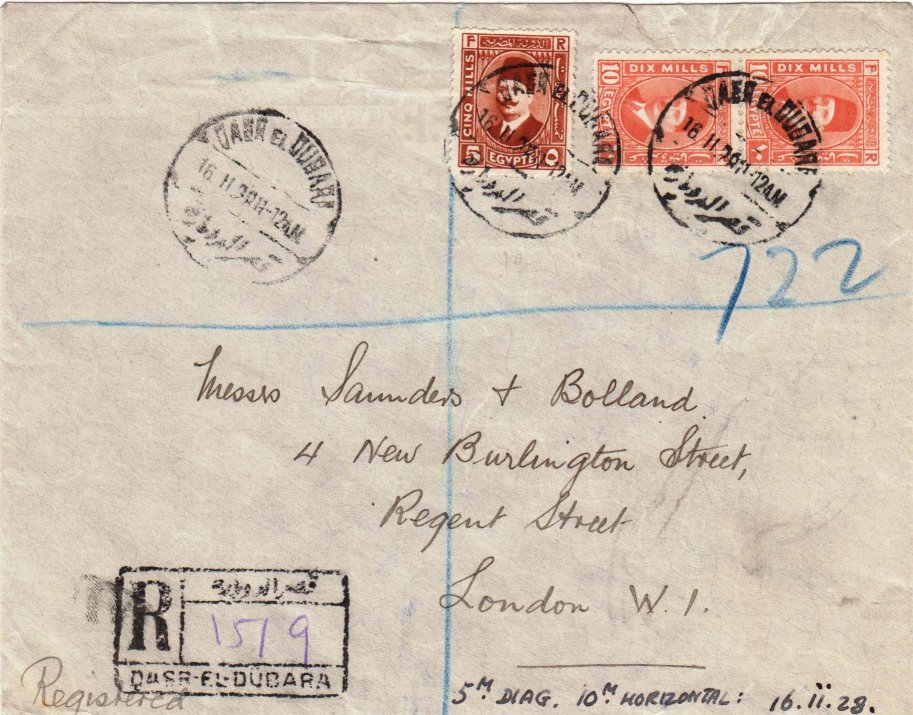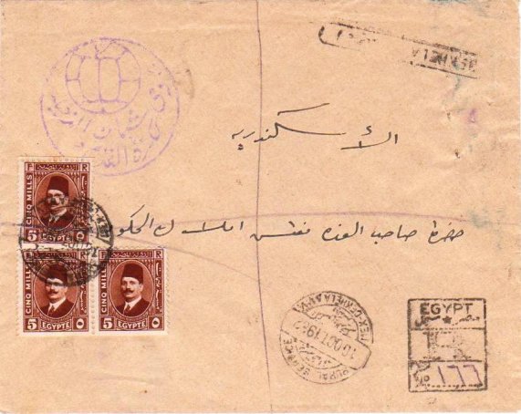 | 517 | 10 OCT 1932, registered cover sent by Dekhela (Alexandria) Youth Football Club to Alexandria Municipality. Franked by 3x5m Fuad booklet stamps, source is Dekhela village (cartouche), followed by Rural Service Mex-Dekhela & V. V. (Murphy p.98), Alex and Salah el Din/Traffic marks behind.. Neat and clean cover  | £45.00 |