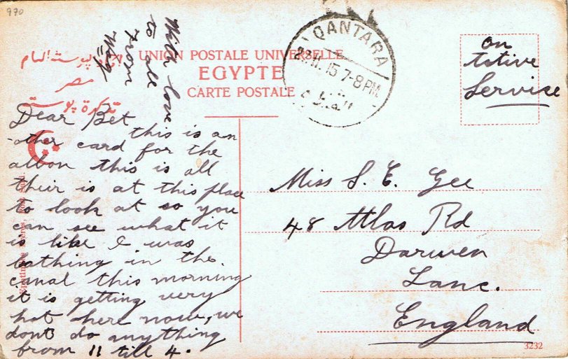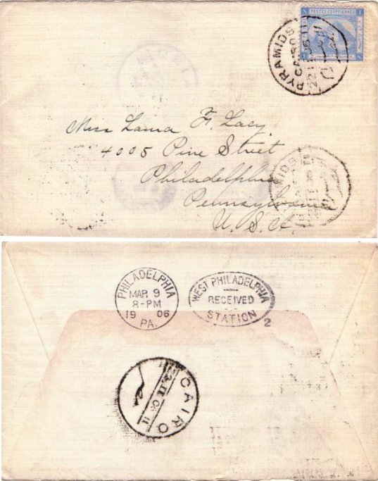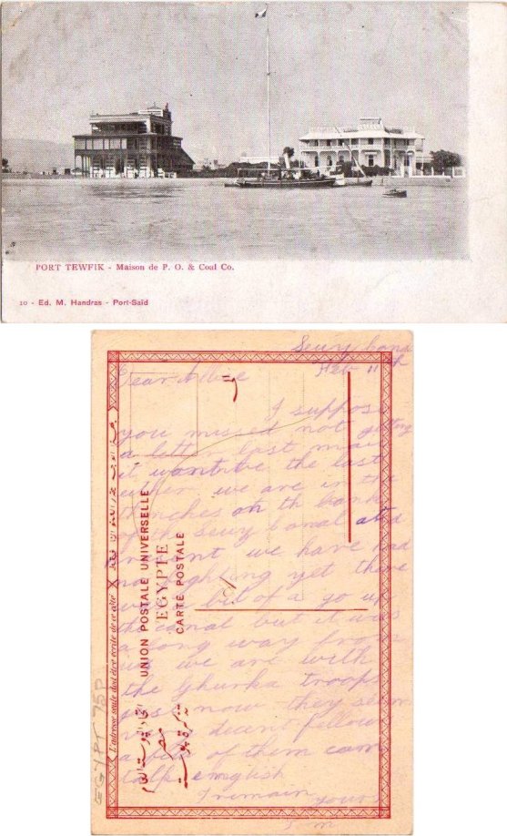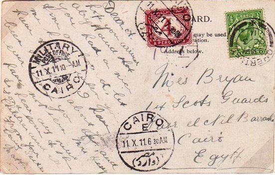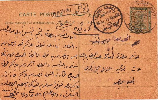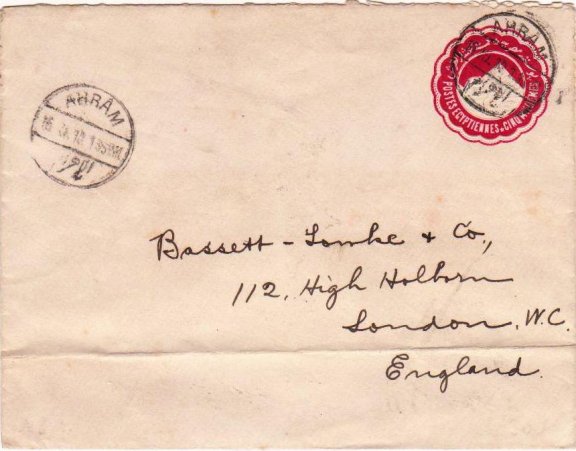 | 526 | 10 VIII 14, small cover, franked 5m DLR pictorial, from Godaieda to Qubba Bridge, with two TPO lines (behind ) - Cairo-Mansura Type 7A4 and Banha-Ismailia (Type 5A3)  | £18.00 |