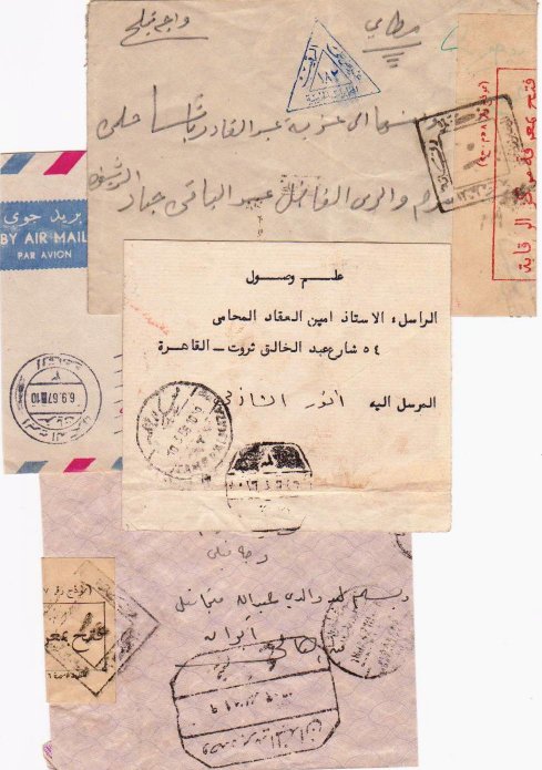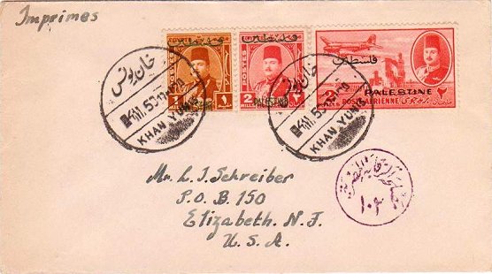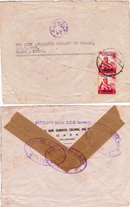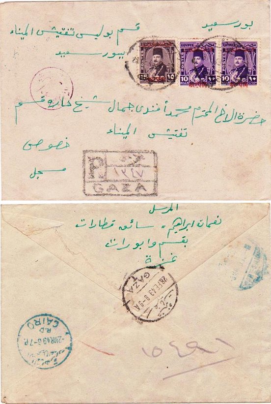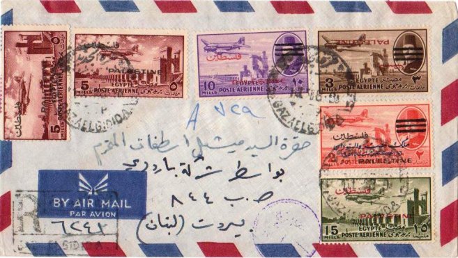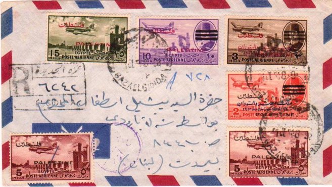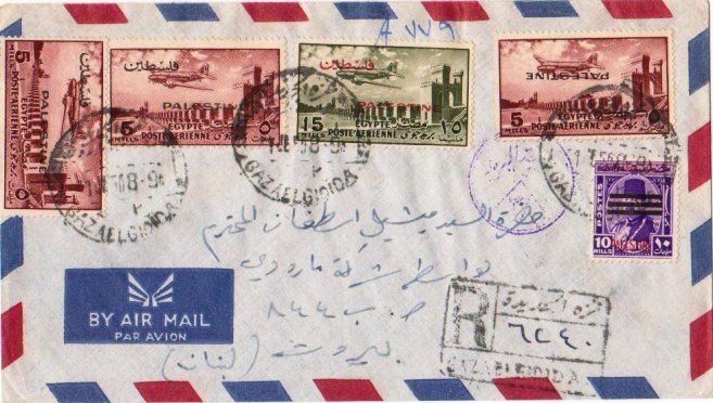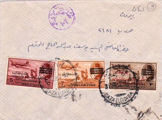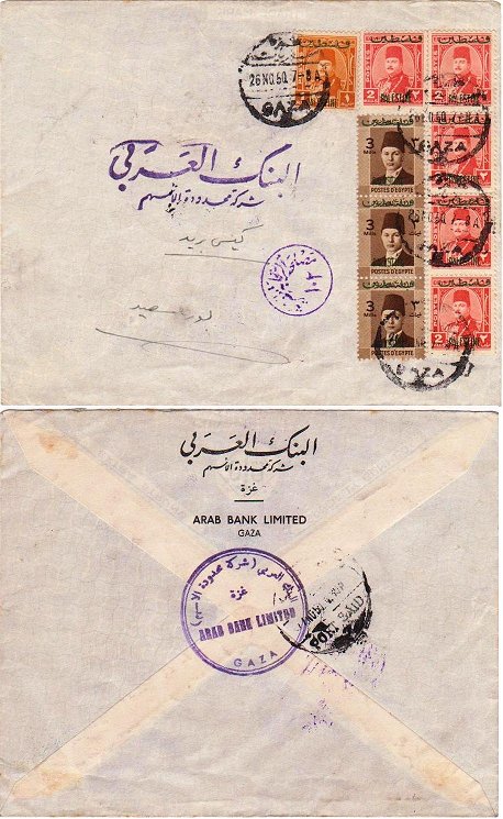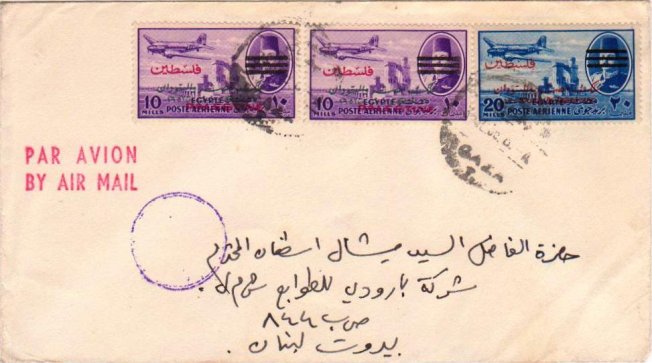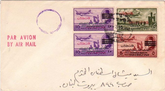 | 492 | 5 AU 55, small cover, Arabic-addressed to Beirut, cancelled with Farouk-barred Air stamps - 7m with bilingual Palestine opt (NP PA16), 5m with KES and Palestine (PA27), and 3m KES with Palestine in red instead of black. Cancelled Gaza el Gidida, violet 102 censor mark, Beirut arrival next day  | £10.00 |