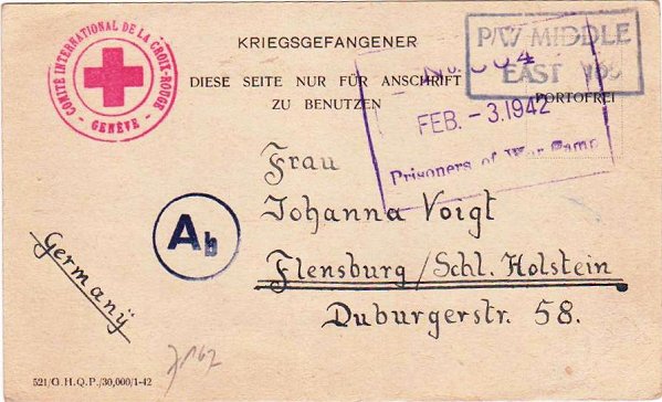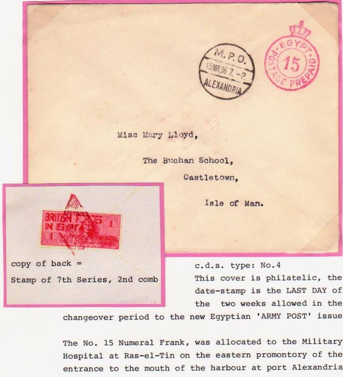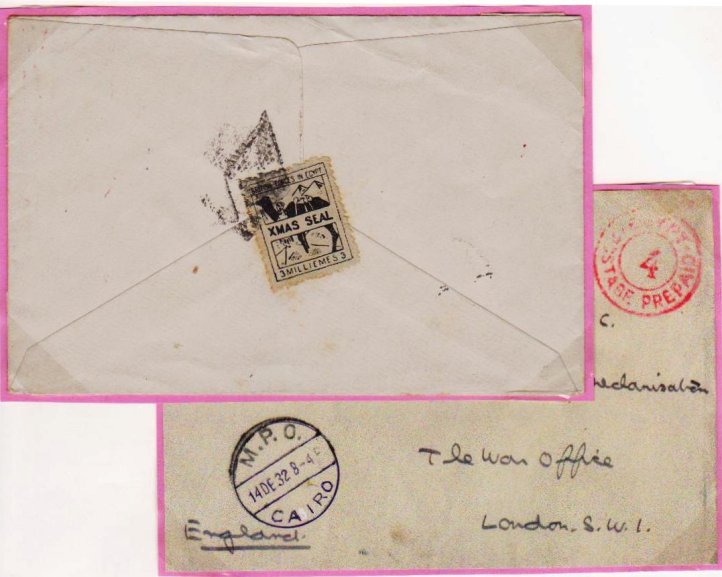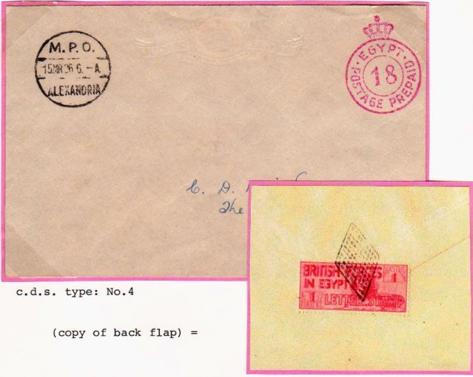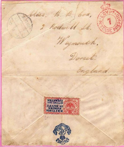 | 6 | British - 27 JY 59 - Alex-Malta, posted at the British Post Office, unstamped, but single circle datestamp in red indicates pre-paid. Blue oval at top left is sender’ s stamp, Malta arrival behind (four days in transit)  | £30.00 |