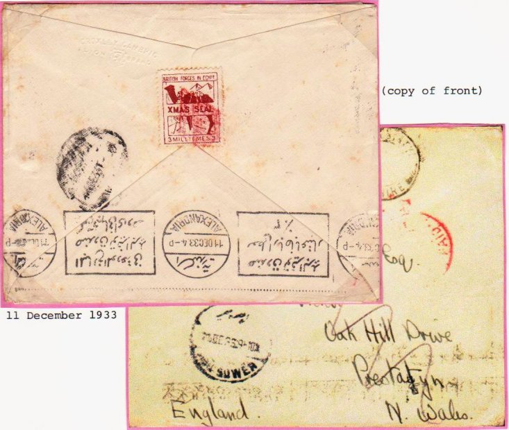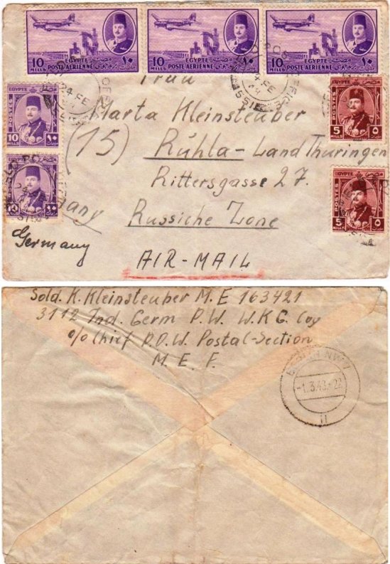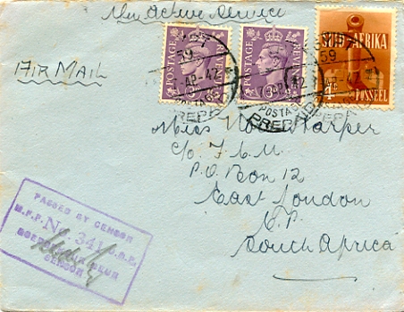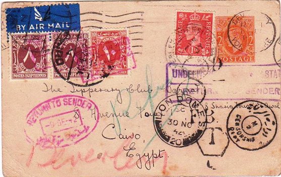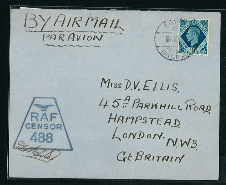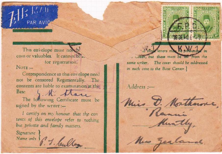 | 34 | 24 NO 49, plain envelope (CU logo on flap) endorsed Air Mail and franked 3x10m Marechal for Belfast, N.Ireland from Alexandria. Egyptian censor, but then sent to New Zealand instead! Belfast NZ arrival 2 Dec, redirected, and manuscript note "Delivered Northern Ireland 13.12.49" Remarkable  | £12.00 |
