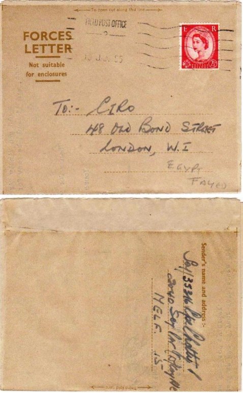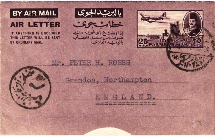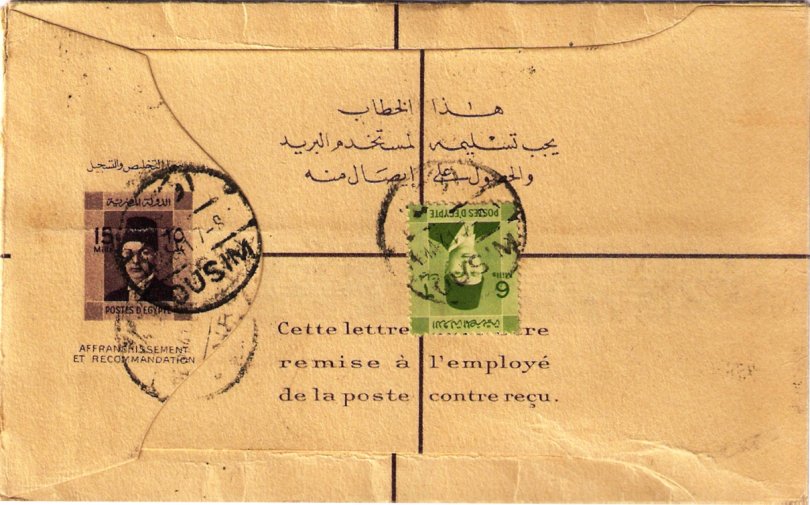 | 493 | 25 AU 55, small cover, Arabic-addressed to Beirut, cancelled with Farouk-barred Air stamps - 5m with KES and bilingual Palestine opt (NP PA27), 2x10m similar (PA28). Also 15m 1955 issue without Farouk (PA 31), with Palestine opt doubled (forgery). Violet circle (worn censor? faint trace arrival mark  | £10.00 |