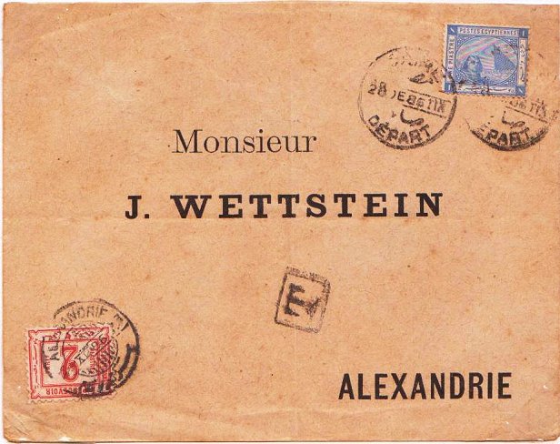 | 26 | 8 JL 30, plain cover franked with provisional 5m on 50m Agric Exhibition (SG 135), cancelled with blue circle of Khedivial Mail and Graving Dock Co / SS Boulaq and addressed to Alex (arrival CDS is 8 JL). No other marking: a Hendry cover not addressed to Hendry!  | £12.00 |