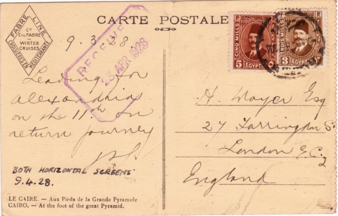 | 32 | 24 JAN 48, intriguing piece of card with 1-5m Farouk Marechal for UK cancelled with indistinct double-ring CDS that appears to read Oronsay RMS. Message reads: "I shan’t be able to post these PCs on board ship as they only accept those with 1½d English stamps on, so I’ m posting this..... in Bombay on shore leave"  | £6.00 |