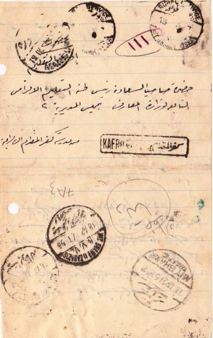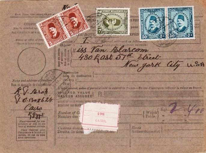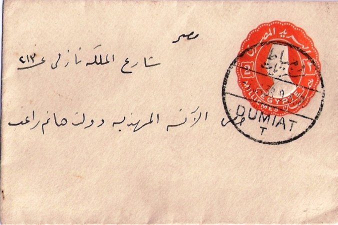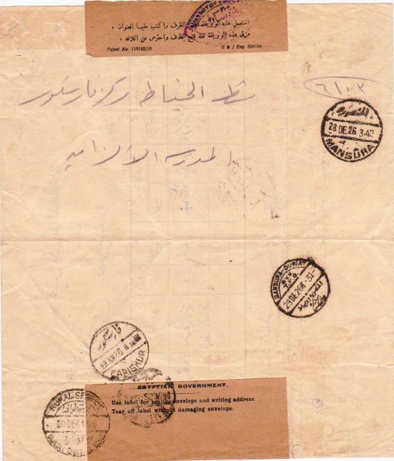 | 515 | 30 DE 26, government form sent from Mansura to Fariskur via Mansura-Dumiat & V.V. TPO (Type 6A2) and Fariskur finally to Rural Service Dumiat-Izbit el Borg (Murphy p.89). Sealed with Government label and Ministry of Education official oval  | £42.00 |