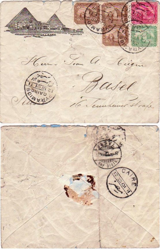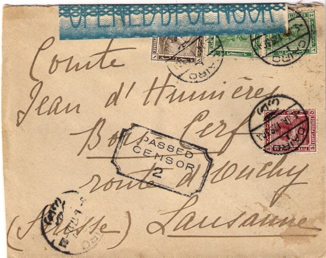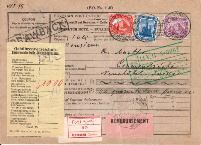 | 456 | 1914, franked 10pi and 4m Sphinx & Pyramid plus 10m Colossi stamps all neatly tied Douane Alexandria R.P. cds. With Drawback handstamp, Alex customs label and pink Egyptian Remboursement label tied Trieste transit mark. On reverse arrival cds Cormondreche (Neuchatel)  | £65.00 |