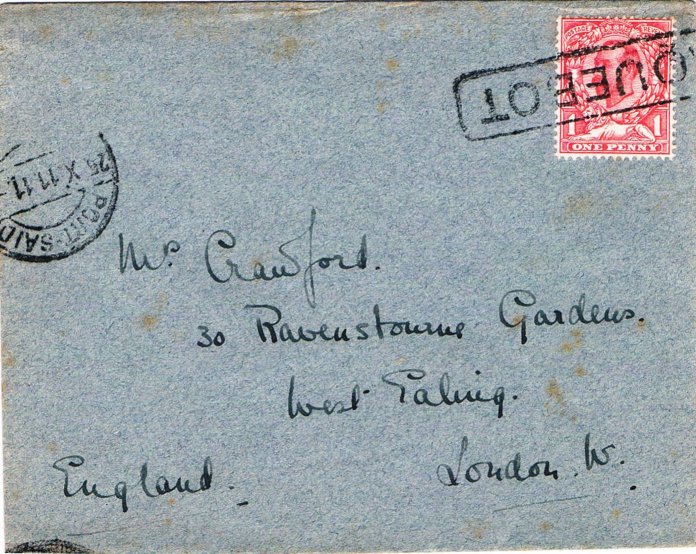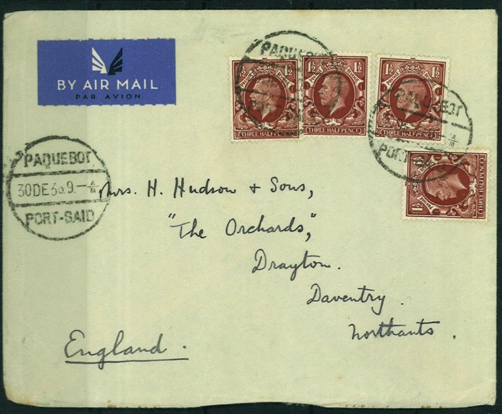 | 474 | Great Britain 1d George V (Mackennal design) cancelled with Port Said "Paquebot" in cartouche and cds of Port Said 25 X 11 on small neat envelope to West London  | £4.00 |