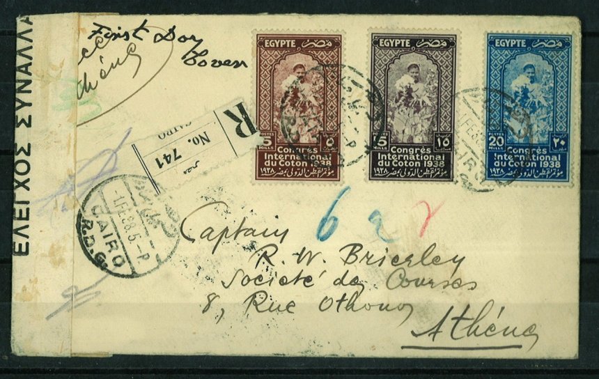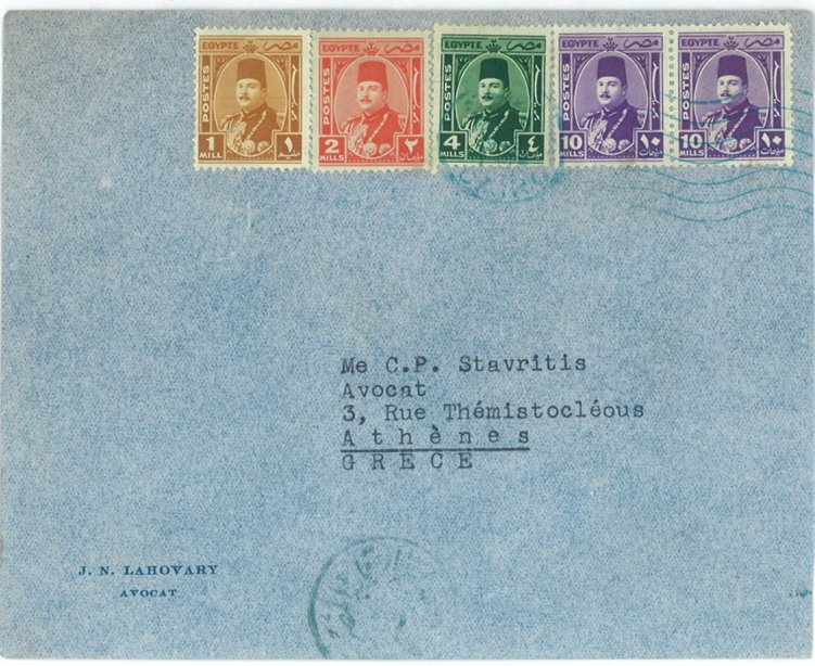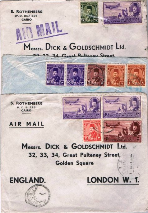 | 477 | Three Farouk Maréchal air covers to same addressee in London with a variety of definitives and airs, all 27 mills rate, two from Cairo, one from Alexandria cancelled blue, all with civil censors. Priced to clear  | £2.00 |