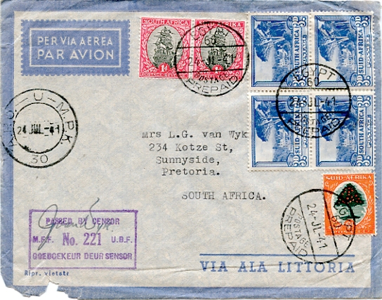 | 494 | 3 JL 56, Air cover, Arabic-addressed for Beirut from Gaza el Gidida (Reg cachet alongside), franked with 2x PA31, PA32, and barred Farouk Air stamps - 2m KES/Palestine (PA25), 10m Palestine (PA18) and 3m Palestine with opt inverted (forgery). Violet 102 censor, backstamps of Gaza el Gidida, Aerodrome du Caire, Beyrouth / Renseignements  | £10.00 |