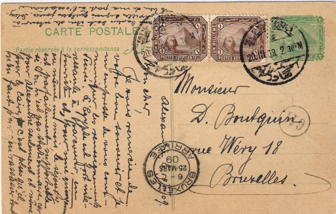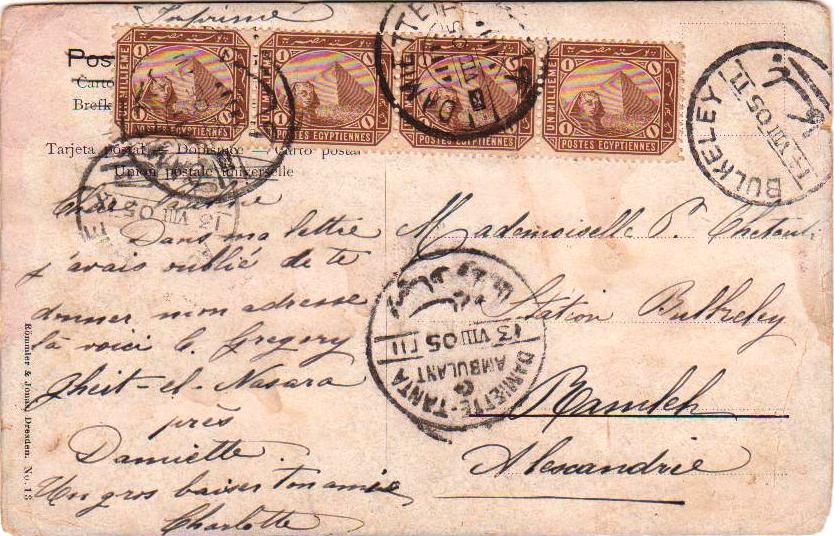 | 525 | 13 VIII 05, colour card marked Imprimes but with long note(!), franked 4x1m DLR for Station Bulkeley from Damiette. Neat TPO cancel Damiette-Tanta / Ambulant with star/crescent (Type 2A3.1) plus Bulkeley arrival  | £14.00 |
