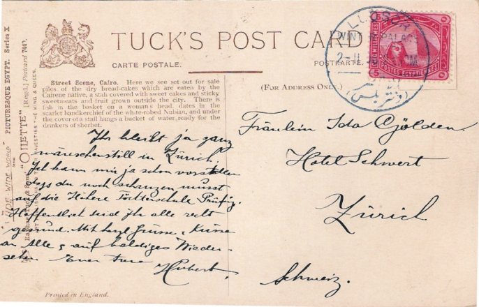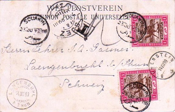 | 506 | 25 JU 99, three-view b-w card - Khaifah, Mahdi’ s grave, and Omdurman - published by the Press Association in London, franked 2x1mill Camel Post stamps and sent from Souakin to Switzerland. On arrival in Suez, boxed T applied and later crossed through. Umstein transit and Langenbuhl arrival marks. Excellent clean condition  | £24.00 |