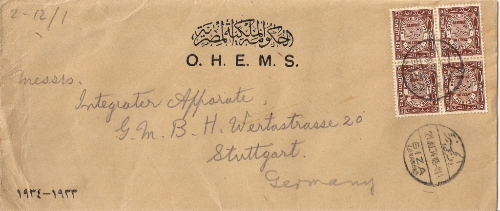 | 455 | OHEMS envelope with block of four SG O142 (some adhesion on back)  | £5.00 |