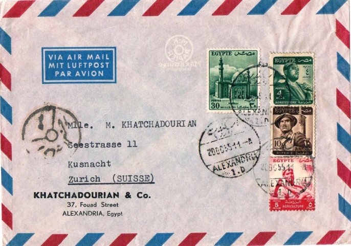 | 478 | Post-Revolution air cover to Zurich franked 49 mills (SG 499,417,418,423) cancelled Alexandria 1.D 20.OC 55 with civil censor. Colourful and clean  | £2.00 |