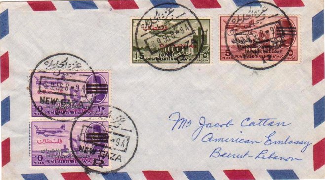 | 498 | 6 9 56, Air envelope addressed to the American Embassy in Beirut, sent from New Gaza / R with pair of 10m barred-Farouk KES/Palestine (PA28), no-Farouk 15m/Palestine (PA32), and 5m barred-Farouk with Palestine, but KES doubled (forgery). Beirut arrival 19/IX  | £10.00 |