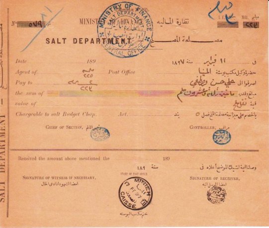 | 499 | 1897, mini-collection of nine Salt department receipt forms in excellent condition, all cancelled with large Ministry of Finance Salt Department double-ring cachet in green-blue, signatories all "signing" with signet ring (actual signatures rare), and authenticated with spot-on CDS of Minieh, Manfalout, Sedfa, Abou Kerkas, Akhmim, Teh el Baroud, Kafr Sakr, Chebrekhit and Atfe. Most unusual. Example  | £28.00 |