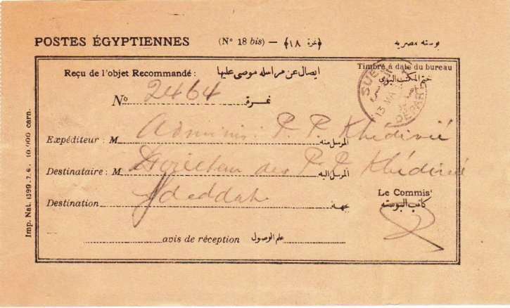 | 500 | 13 MA 89, Registration receipt for item sent by the Khedivial Paquebot line to the director of its Jeddah office, despatched from Suez / Depart CDS. Excellent condition  | £14.00 |