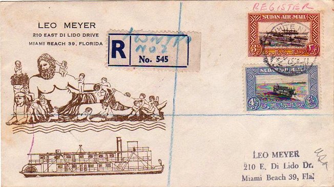 | 507 | 2 OC 51, Leo Meyer ornate printed envelope (Roman statue of the Nile river god), franked with 3½ and 4½ PT Sudan Air Mail stamps for registration, cancelled White Nile TPO No 2 for Miami via Khartoum, and New York (reverse)  | £14.00 |