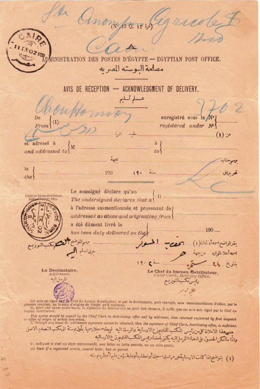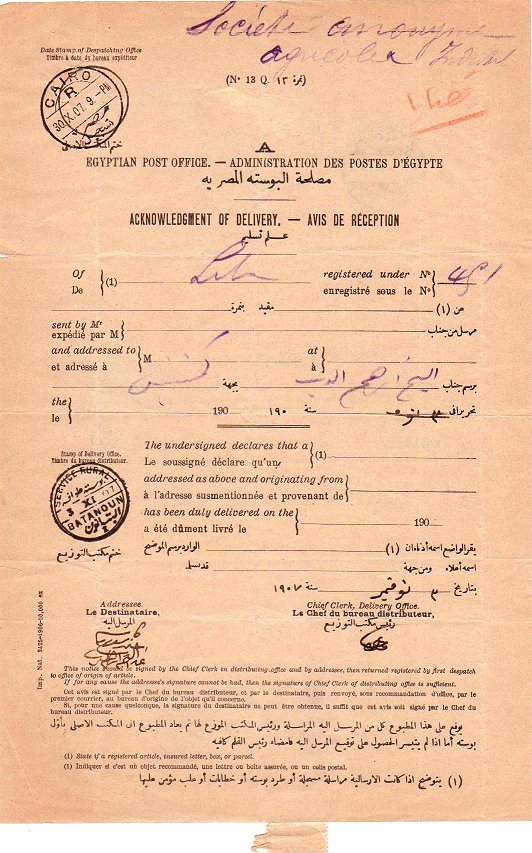 | 509 | 24 IX 02, Official receipt for registered article or Avis de Reception, to do with a registered item, sent from Caire / R and returned with authentication of Service Rural / Abou Hommos CDS (Murphy p.53)  | £35.00 |