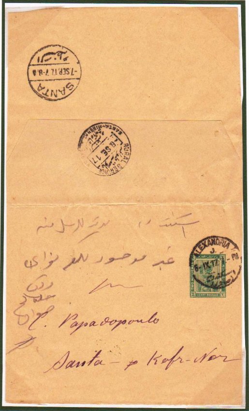 | 512 | 5 IX 17, 2m DLR newspaper wrapper addressed to Santa from Alexandria / J. Transit of Santa, followed by Rural Services Santa-Minshat el Gidida in arrival. Addressee not found, returned to sender  | £65.00 |