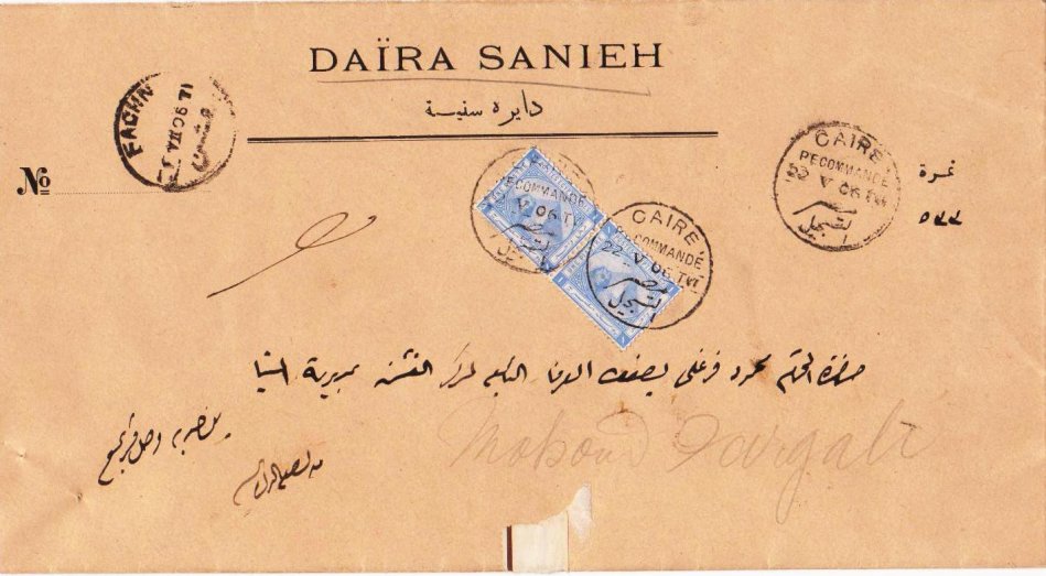 | 519 | 20 V 06, Daira Sanieh (the khedivial estates) printed envelope franked 2x1pi DLR (SG 54) and sent from Cairo / Recommande to Fashn near Minya. Addressee not found and returned via trilingual auxiliary boxed marking Unclaimed (on reverse). Clean unusual cover  | £34.00 |