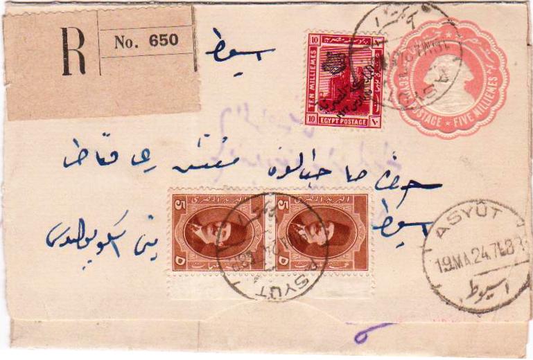 | 522 | 19 MA 24, 5 mills postal stationery letter sheet (wmk Egyptian Postage, NP SLS9) uprated with 2x5m First Fuad plus 10m Crown overprint (SG 103) for postage and registration within Asyut. Full Arabic letter enclosed  | £38.00 |
