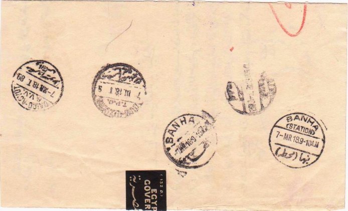 | 527 | 7 MR 18, official letter from Qena Finance administration to Banha, unfranked (Government official oval and white on black label), with two TPOs - Cairo-Asyut Type 7A3 and Cairo-Alexandria Type 5A2), together with excellent early Banha Station cds  | £10.00 |