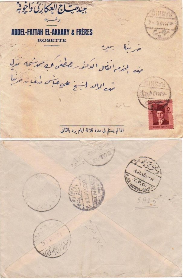 | 528 | 6 JU 40, printed business envelope franked 5m Boy King and sent from Rashid to Kherbeta. Markings behind include two TPO, unrecorded Tod-Wafaieh (faint, 7 JU) and Type 5A2.5 Alexandria-Cairo (6. JU), with transit marks of El Tod and Kom Hamada  | £38.00 |