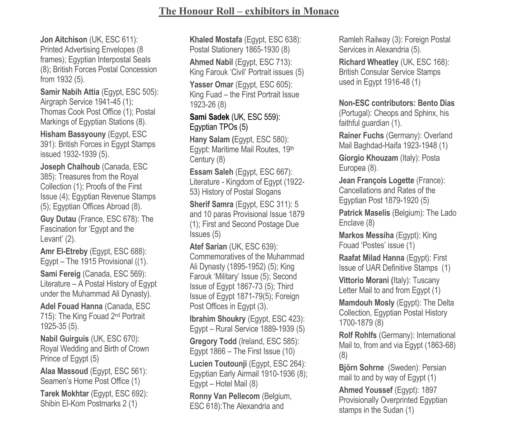 The non-competitive exhibition, Treasures of Egypt, was graced by the patronage of Prince Albert II of Monaco and by the presence of ex-King Ahmed Fouad of Egypt, son of King Farouk, who showed enormous interest in examining many of the most significant exhibits from his native land. The Egypt exhibition, which ran alongside a similar display of Maritime material, was a personal triumph for Hany Salam of the PSE (ESC 580), who as a member of the Club de Monte-Carlo has lobbied