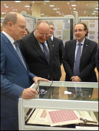 significant stamps and documents. Among the exhibitors was Her Majesty the Queen, Prince Albert himself, and Hany Salam. What an honour! Hany, the main driver behind the special Egyptian presentation, with the strong support of Patrick Maselis, president of the Club de Monte-Carlo, and Sherif Samra, was rightly praised for his organisational skills. The Egypt exhibition reflected the outstanding contribution of Egypt to international philately and provided a superb historical background to its wealth and complexity. Hany Salam acted as host and guide to Prince Albert and ex-King Ahmed Fouad on an extended tour of the frames, and the former king, accompanied by his daughter, Princess Fawzia Latifa, graciously agreed afterwards to meet the Egyptian exhibitors, many of whom gave him personal philatelic gifts. The Princess returned on the final day for another look back at Egypt’s history in stamps. Both were very friendly and approachable, involved for at least two hours talking to our members and posing for photographs. The exhibition involved many of the giants of Egyptian philately, with so many rare and stunning presentations that it would be impossible to discuss them all. So a few highlights will be mentioned to provide an idea of the outstanding quality of exhibits. Joe Chalhoub presented Treasures from the Royal Collection, with the 1948 Farouk Military issue 50 piastres displayed both as an imperforate blue frame colour trial and full imperforate sheet. In addition, he showed a stunning complete seven sheets of proofs of the First Issue. Greg Todd presented his unsurpassed collection of the First Issue including the renowned block of 53 of the 1pi. Yasser Omar showed a detailed Fouad First Portrait exhibit including proofs and the largest imperforate block of 21 of the 200 mills. Atef Sarian presented an incredible collection of the King Farouk Military issue including many rarities. Sami Fereig and Sherif Samra were granted a private meeting with ex-King Ahmed Fouad, and presented him with a copy of Professor Fereig’s three-volume tour de force of the Postal History of Egypt. The former monarch spent a significant amount of time and interest in examining the books.