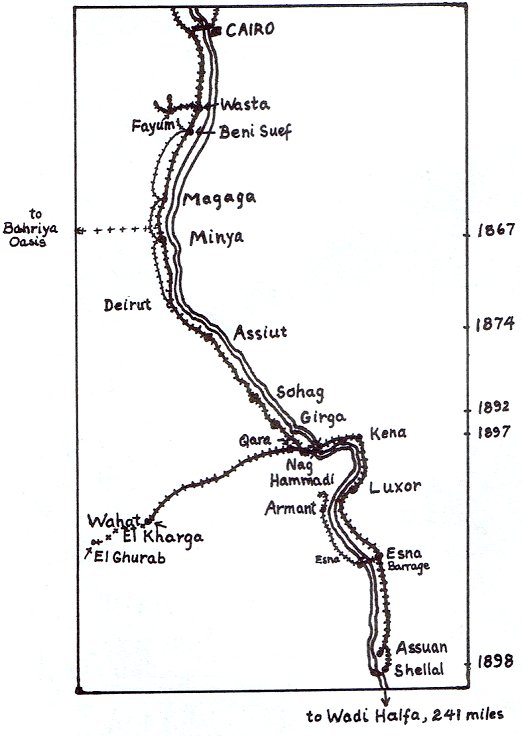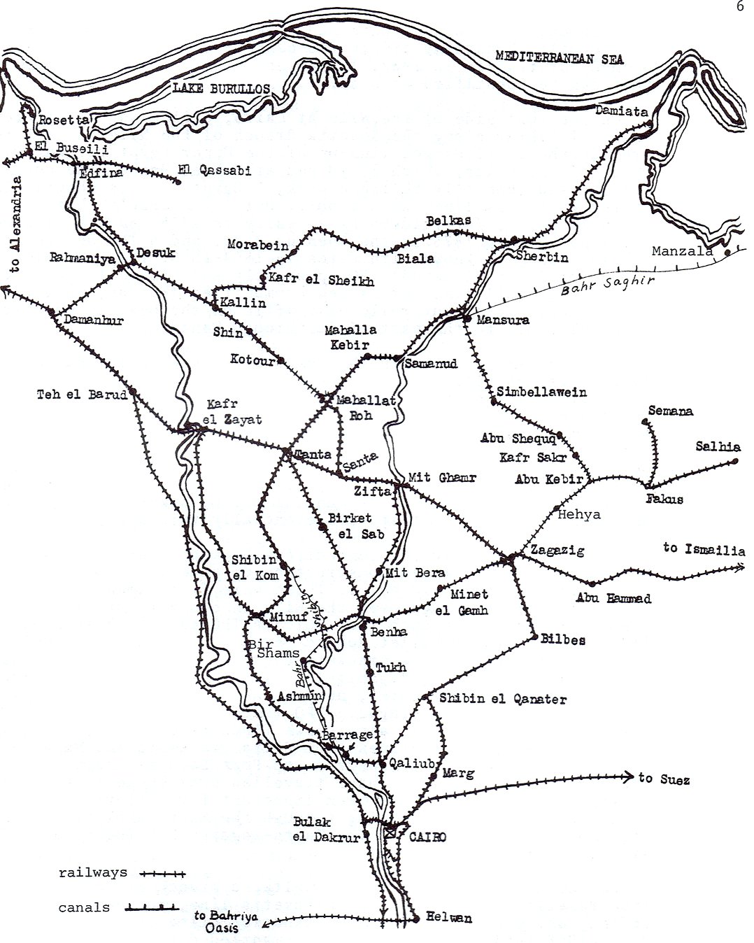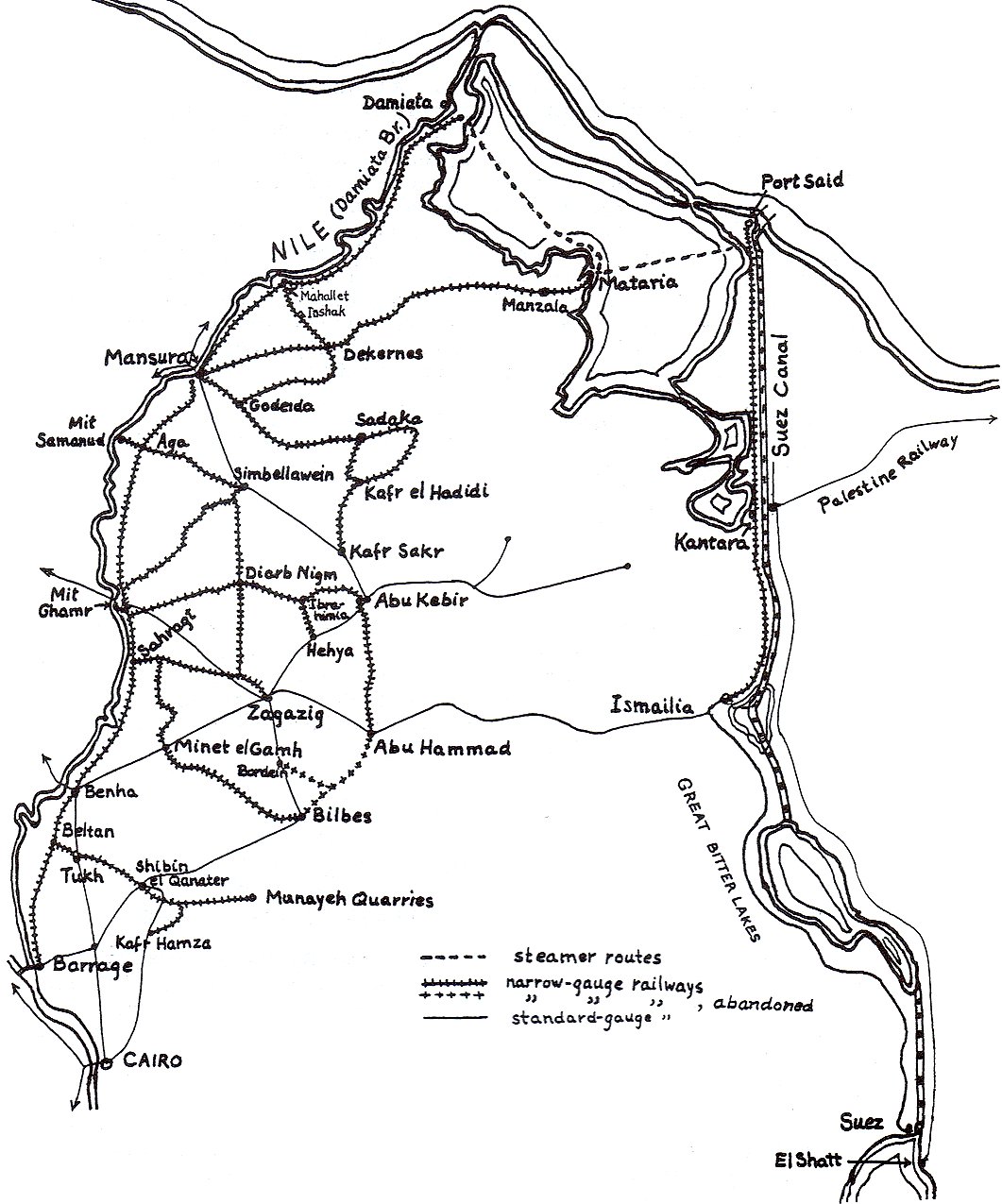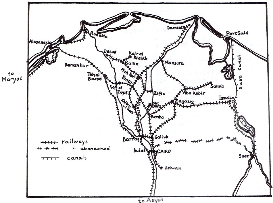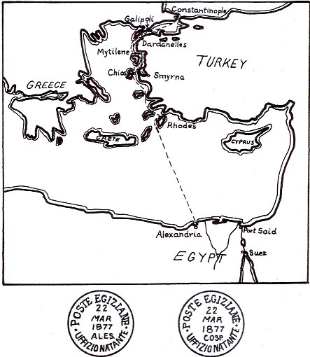 PREFACE Egypt has an unusually special place in the world owing to its magnificent ancient history, its prominence in modern history, and its geographical position astride the connection between two continents and the major thoroughfare between the eastern and western worlds. Although it is an African nation, it looks more to the Mediterranean for its commerce, and to Arabia for much of its culture. It is natural that the first railway in the African continent should have been built in Egypt; it was opened for traffic in 1854, antedating the railways of several European nations. The railway system developed into such an extensive and elaborate one that it is probably the largest in Africa. It gave rise to a network of travelling post offices that had a larger number of routes than all the other countries of Africa combined. This study of the Travelling Post Office Service is largely derived from postal markings on covers and stamps, supplemented by information found in the Egyptian Postal Guide for some, but by no means all, relevant years. Other material from the government archives must certainly exist, but access to it is not feasible for persons not resident in Egypt, and much is said to have been lost by fire and other means. The most serious consequence of this situation is that the dates of opening and closing of TPO routes are very uncertain, especially in the case of those routes that handled only a small volume of mail. The pioneer studies of Gabriel Boulad and L. Seymour Blomfield provided the basis on which the present study is built. INTRODUCTION Although the trains were immediately put into use for carrying the mails in 1854 when the first rail line, from Cairo to Alexandria, was opened, facilities for sorting the mails en route were apparently not provided until twenty years later. The earliest known date stamps of a travelling post office in Egypt are those of the Alexandria-Cairo line, in 1875. It is therefore appropriate to look at the state of the railway system in 1876. It is shown in Fig.I The network has been much expanded since that time, but the lines of 1876 still are the heart of the Egyptian State Railways. In addition to the State Railway, which is standard gauge and connects the cities, there is an extensive system of agricultural light railways in narrow gauge, built and operated by private companies. They are important to us, for nearly all the routes carried travelling post offices. Although these lines served some major cities, none of them terminated at either Alexandria or Cairo, and their primary purpose was to provide transportation of goods and communication to the great number of farm villages that otherwise had to depend on foot traffic or beasts of burden. The railway built and operated by the Suez Canal Company between Port Said and Ismailia was also built to narrow gauge, but was not part of the agricultural lines, and was later incorporated into the State Railways. Another important feature of the railways of Egypt is the fact of a major division between the network north of Cairo (i.e., in the Delta), and the lines to the south. These two divisions were built as separate entities, without physical connection or interchange. At their closest juncture, Cairo, they were on opposite sides of the Nile; they were joined only in July, 1892, when a railway bridge was completed at Embabe. Even after that event, no TPO's ever passed through Cairo, but instead, terminated there. Lastly, there are the waterways. The Nile is navigable for most of its length in Egypt, and many of the canals are also navigable. There has been service by postal steamers carrying TPO's on sections of the Nile, on at least two internal canals, and part of the Suez Canal. These different types of lines will now be taken up in sections, beginning with the State Railways in the Delta. II LOWER EGYPT A. The Egyptian State Railways The earliest date for the first TPO, the Alexandria-Cairo route, is February, 1875. This route remained the only one until the early 1880's. At the time of its inception, the Egyptian Post Office was largely operated by Italians, a legacy from the origin of the postal system as a private concern, called the Posta Europea. This concern was bought out by the government in 1865, and its head, Giacomo Muzzi, became the first Postmaster General. As a consequence, the early postal markings of Egypt were inscribed in Italian, which gave way to French and Arabic gradually between 1877 and 1884. The first TPO date stamp was thus inscribed AMBULANTE I ALES-CAIRO (or CAIRO-ALES). It is extremely rare, only a few examples being known as backstamps on covers, and fewer still as cancellations on stamps. The many different types of postal markings that followed this one are listed in section IV and illustrated in section V. The Alexandria-Cairo TPO continued to run at least into the 1950's, and may still be in existence. New TPO routes were not added until the 1880's. The earliest I know of is DAMIETTE-TANTA, starting in 1882. At this point, it is good to remind ourselves that the only source of dates available is the philatelic evidence: recorded postal markings, and actual dates of operation of a TPO, may extend many years before or after the dates presented in this study. Even the historical date of opening of the corresponding railway line may not provide a reliable beginning, for some railway routes were antedated by river steamer routes. It would appear that all the other stretches shown in Fig.I eventually acquired TPO's, although not all have been seen as early as the 1880's. Only the direct line from Cairo to Suez must be excepted, for it was abandoned shortly after the opening of the Suez Canal (1869), long before the inauguration of any TPO service. A Cairo-Suez TPO nevertheless existed. It ran via Zagazig and Ismailia, and its postmarks have been seen from 1889 to 1898. The following list shows the TPO's known to have run on the early network of Fig.I; the d