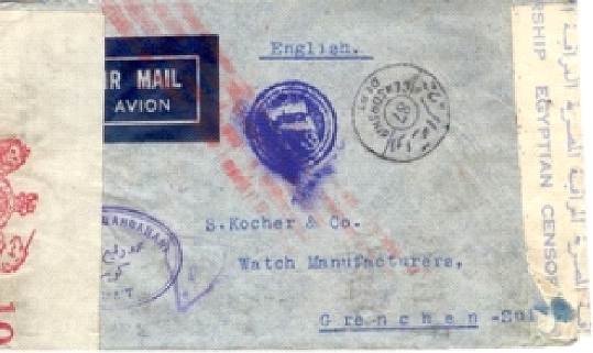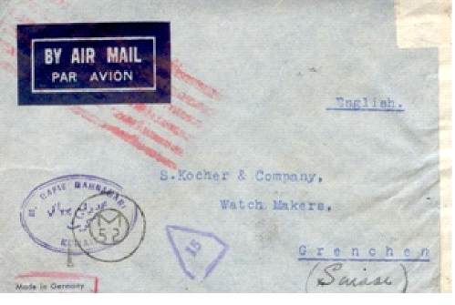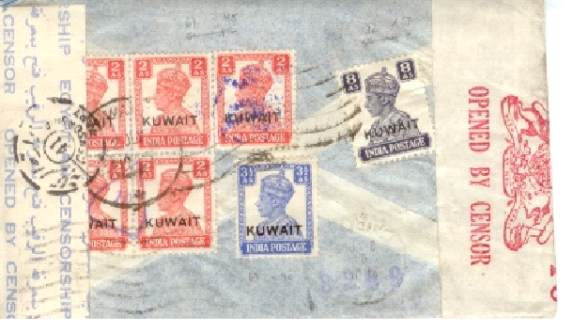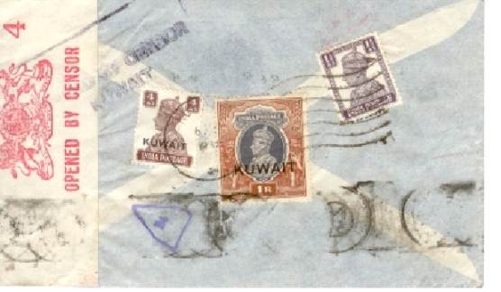 | Q12 Febuary 2, 2006 non member I have the attached two covers from Kuwait, dated 6 April 1945 and 2 July 1945, to Switzerland. Both travelled via Egypt and were censored in both Kuwait and Egypt. I would like to know whether the air cancel with six bars and five bars (in red) was used in Egypt or in UK and the reason for such cancel? R1 Febuary 11, 2006 member 240 I know nothing of the postal rates in operation at the time, except that both covers were furnished with the same postage - 1 rupee, 5 1/2 annas - comprising all Kuwait overprints on India for the later cover, and a combination of Kuwait overprints and one Indian stamp on the earlier. It seems that this was not enough to defray Air Mail carriage for the full journey, for the red bars have been applied to cancel the Air Mail indicator at some stage. Ian McQueen's Jusqu'a Airmail Markings (1993) illustrates precisely this marking as being used in London from 1945-47, in red, and comments: "There were several roller cancels of six bars which were used in London, though because of the way they were used it is very difficult to distinguish between them. This illustration is from a cover from Malaya to Massachusetts in 1945. Sometimes the roller was so imperfectly applied that only five of the six bars are visible." |
