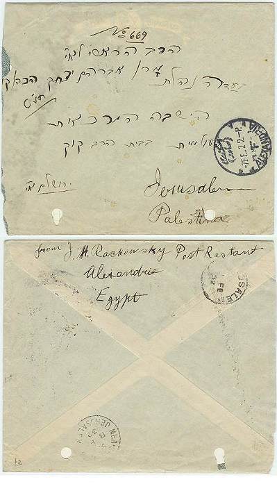 | Q2 This cover from Alexandria to the Chief Rabbi in Jerusalem dated 7 Feb 1922 bears no stamps and there is no marking of payment either regular or taxed. There are no traces of a stamp having been placed in the top right corner. Can anyone explain why it was not charged? |