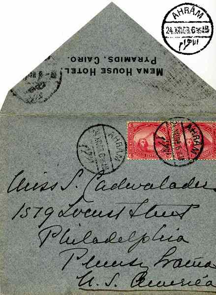 | R4 September 26, 2006 member 213 I have: l. A postcard with manuscript "Mena House Hotel, Pyramids, Cairo" franked 4 milliemes DLR to Cornwall cancelled 14.IV 09 at 6.35 PM. 2. A postcard with manuscript "Mena House, Pyramids, Egypt" to Cardiff franked two 2 milliemes DLR cancelled 13.Xll.10 at 6.30 AM with Cairo B transit same date but at 8. AM. This is the latest date so far. |