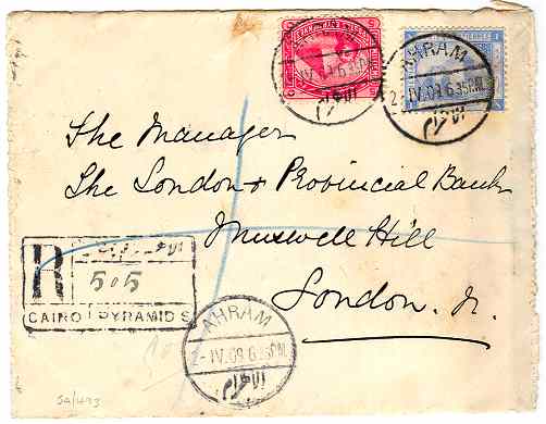 | R3 September 25, 2006 member 239 I found this cover tucked away in a dealers box at the recent stampex. It is dated 2 IV 09 making it the earlist date. It is backstamped Cairo R 2 IV 09 and REGISTERED LONDON E.C. 8. 4. 09 It has a registration box for the PYRAMIDS so poses the question is this the same registration box used with the PYRAMIDS postmark? ![]() |