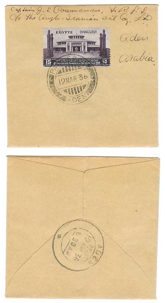 | Q34 March 22, 2007 member 595 Aden Paquebot I haven't seen anything similar before with an Egyptian stamp, being the 1936 15 mills Agriculture issue, with 2 different Aden postmarks both dated March 12, 1936. I picked this up at a local stamp show not knowing a thing about it. Can anyone shed some light on this cover? Thank you. |