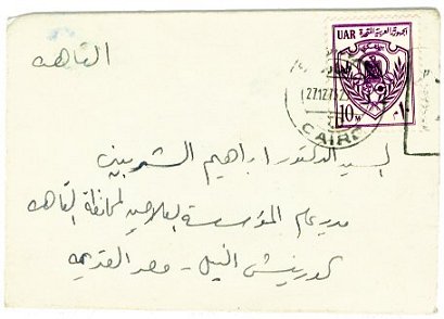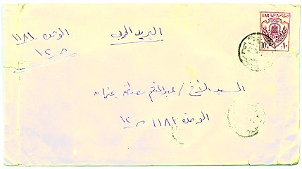 | Q39 May 14, 2007 member 239 The 'Military' stamp issued on April 15 1971 was for use to military personnel at a concessionary rate of half that current. When was this concession terminated. The last date I have for the use of the single stamp on cover is 9.12.73. The one illustrated is 23.11.73 but has a clearer datestamp. So when was the concessioned stopped and does anyone have a later date cover with the stamp used as intended. ![]() This stamp was also used by itself and with other 10 mil stamps for use to pay the normal 20 mil postage. Of these several I have seen predate ones using the single stamp so when did this practice start. The one illustrated I assume was not addresses to a member of the military can one of our Arabic reads shed any light on this. ![]() I understand it was introduced to encourage mail to bolster moral. Am I being too cynical to suggest that once the 1973 war was over such moral boosting was not deemed necessary and the concession quietly drooped a short time after? |