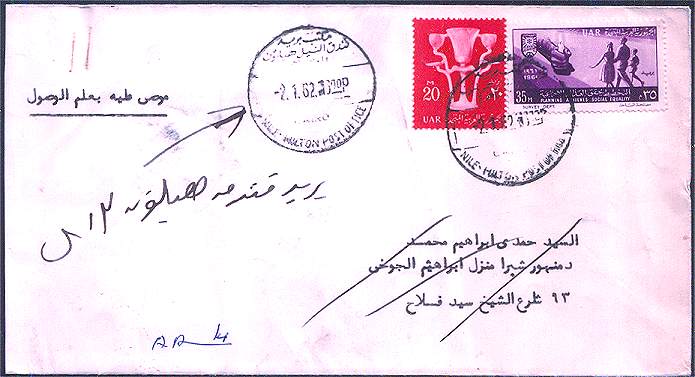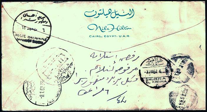 This Nile Hilton cover, sent with a Type HN2 Hotel CDS on 2.1.62 to Damanhour, was franked at a rate of 55 millièmes,