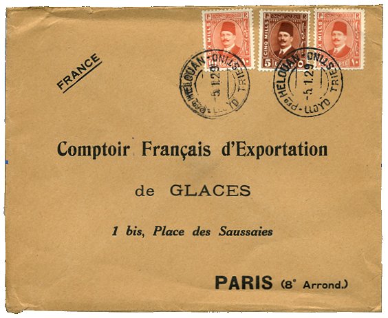 | Q43 September 6 2007 member 575 I have a clear cancellation Pfo Helouan - Lloyd Triestino 5.1.29 on a cover of the Comptoir Français d'Exportation de Glaces with a printed address in Paris. The envelope is franked with 2x10mills and a 5mill of the Second Fuad issue totalling 25 millièmes. Can any member please furnish more information about this (maritime mail?) postmark? |