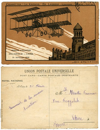 | Q44 September 6 2007 member 575 I have some publicity postal cards originally published on behalf of Cigarettes "Le Khédive" Ed. Laurens to mark the Heliopolis Semaine d’Aviation in February 1910. The one illustrated seems to have been used from Cairo, but the date is illegible, and the stamp appears to have been lost. I have two queries: how many cards exist in this series; and how many of them (as in this case; see reverse) were reprinted by the Hotel National? |