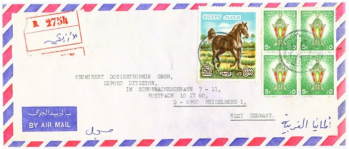 | Q45 September 23 2007 member 239 Mixed currency Mixed currency might not be the right term as Milliemes and Piastres had been around a long time. Egyptian stamps had their values in Milliemes since the De La Rues and the last one to use Piastre was the crown overprint on the 2pi post due. On January 28, 1982 Piastres were reintroduced as due to inflation the Millieme has almost become valueless and at 10Milliemes to one Piastres the number of the denomination dropped by a factor of ten overnight. The first stamp was the commemorative for the 14th Cairo International Book Fair and at 3p (30m) and was for the internal letter rate. This was followed by four other stamps all in Piastres until the set for the International Conference on Marine Science was issued on April 24 but this set reverted back to Milliemes. The following issues all continued to use Piastres until July 5 1983, just over a year later, when the Ramadan festival stamp was issued as 20mill. This was the last use of Milliemes on Egyptian stamps. Why this reversion to Milliemes, I can only think these stamps were designed before the decision to use Piastres, possible the festival stamp may have been designed the same time to the previous one Were Milliemes stamps ever demonetised and perhaps are they still valid to day, any ideas? What you can find are covers of this period using both Milliemes and Piastres stamps which appear to go through the post OK. Again however using 10m = 1p the rates of the covers I show don't seem to quite make sense. Has anybody got later covers then these where Milliemes stamps were used either with Piastres stamps or alone? |