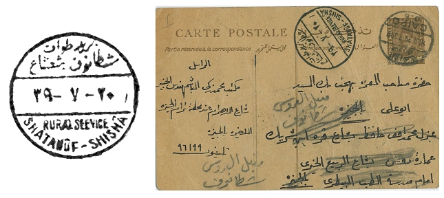 | Q46 January 21 2008 member 172 Rural Seevice I have a postcard with a Rural Service cancellation with Arabic date 20.07.39. Route Shantanuf-Shisha. The word service is clearly wrongly spelt ‘SEEVICE’. Has any other member seen a similar rural postmark like it. |