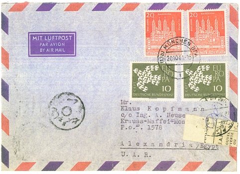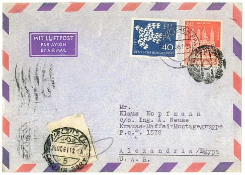 | Q47 January 21 2008 member 533 Censored mail re-sealed I have several covers from Germany to Alexandria between 17.7.1961 and 26.10.1961 with Egyptian censor marks. Two of them were cut to have a look in and then closed by an adhesive on label. Have any of our members seen anything similar and why were these covers censored. |
