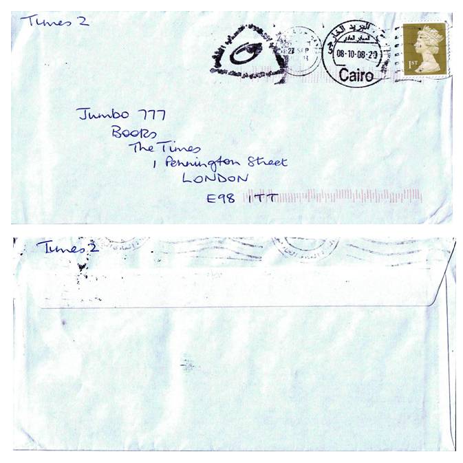 | Q58 Febuary 2009 member 240 Missent to Cairo?. Does Cairo have a "Missent" handstamp? And if so, why doesn't it use it? That's the only explanation I can find for the odd crossword entry illustrated, sent with a First-class stamp from somewhere in UK and clearly addressed to The Times at its postcode London E98 1TT, with the stamp machine-cancelled 27 SEP 2008. Next is a very faint Egyptian machine marking on the reverse with no clear date. And then it has a clear Cairo machine cancel dated 08.10.08 at 8pm. It was then sent back to The Times, where I retrieved it, unfortunately too late to be considered for its crossword prize. I can only imagine that the UK address-reader saw E98 1 TT as Egypt - and sent it merrily on its 4,258-mile round journey. |