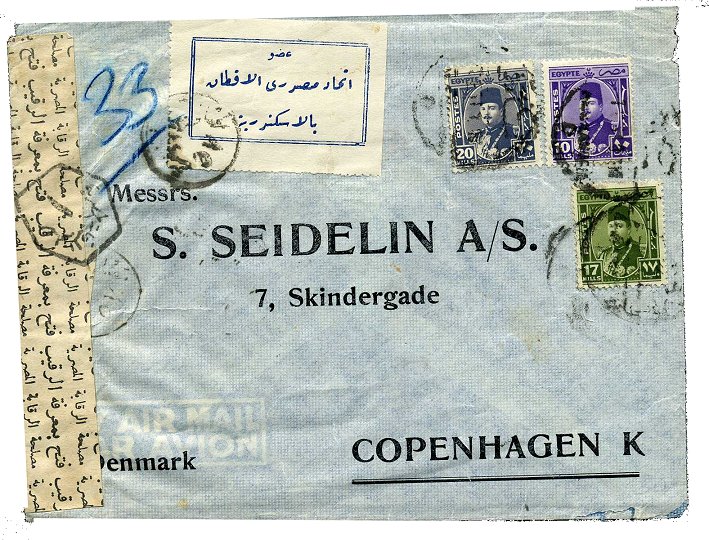 Reply 1 member 122 The label in question is not a censor label but reads "Member Cotton Exporters Union in Alexandria" and is essentially an advertising label. Editor: Since the report I have seen two other covers with the same label, both on printed envelopes of cotton export companies. |