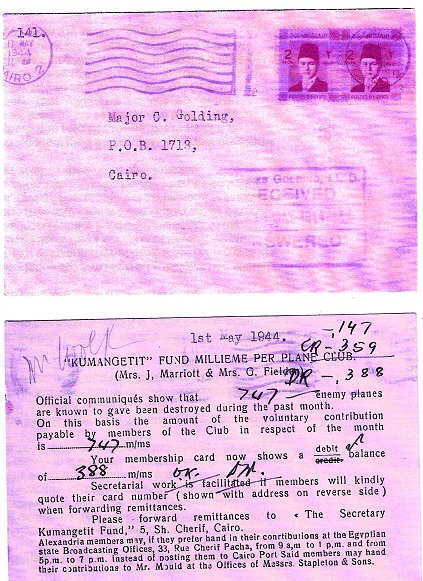 This Post Card used 1st May 1944, does anyone know to what this Fund refers to ? and what were the Funds raised used for ? Apparently you paid one millieme per month for every Enemy plane destroyed.