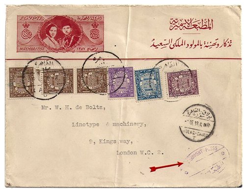 | Q76 July, 2010 member 383 Postal stationery Discussing postal stationery in his treatise, Peter Smith remarks (page 667) that in 1938 "on the occasion of the birth of the Royal child (…) a non-dominated formula envelope was prepared featuring the same design as the adhesive commemorative stamp for the Royal Wedding, but without denomination, in dark carmine". This envelope is shown as Fig 26 on his next page. I have found a similar, but larger envelope of the same sort; it measures 17.5 x 13.5 cm against 15.3 x 12.3 cm for the one described by Professor Smith. My envelope has been used by THE GOVERNMENT PRESS, the printers of these envelopes. It is franked with 54 mills in Official stamps and sent on 1 DE 38 to London. The tariff of 54 mills corresponds with a letter of the fourth weight class (80 to 100 grams). Apparently the Gov-ernment Press (Smith speaks of "State Printing Works") was using up (part of) its stock of unusable envelopes as the Arabic "inscription included the phrase 'royal child' in the masculine, whereas a girl was born" (Smith, p. 667). Has anyone seen this envelope (or the smaller one) postally used? |