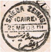 saint, a granddaughter of the Prophet Muhammad. There are various transliterations of her name, including al-Sayyida Zeinab, Sayida Zainab and Saieda Zeinab (which is probably what the Registration cachet reads). I can illustrate another version of the postmark with a variant spelling 18 months earlier. The 1892 Postal Guide records the area as having a postbox (titled Saida Zenab) rather than a post office, but by 1897 it is one of 24 Cairo districts served by house-t-house delivery. In 1911 it is a Class 2 post office barred from specie, insured letters or parcels but able to sell international reply coupons and postal orders and had a savings bank section. Vaillant Bey is difficult.