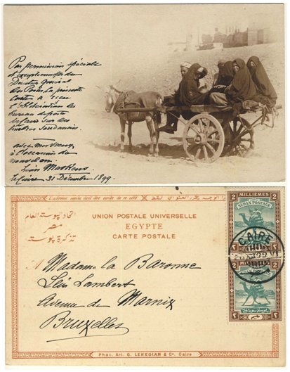 | Q78 July, 2010 member 534 the Baron Léon Lambert This is another picture postcard found on an auction website. It was sent from CAIRE on December 26 1899 (26 XII 99 VI), even though the franking of a total of 4 millièmes was with Sudanese stamps. The addressee is the Baroness Léon Lambert at Marnix Avenue in Bruxelles, Belgium. On the view face there is the handwritten mention in French: "With special and exceptional permission of General Director of Posts, this card received the cancellation of post-office of Cairo on Sudanese stamps - With my wishes for the happy New Year - Leon Maskens - Le Caire 31 December 1899". Can any member report having seen any other item like this? I have been able to research nothing about this baroness, but the Baron Léon Lambert has a street with his name in Bruxelles (Belgium). He is known as a great banker and a patron of the arts. Léon Maskens seems to have been a water colourist see: here. He was also consul in Egypt. |